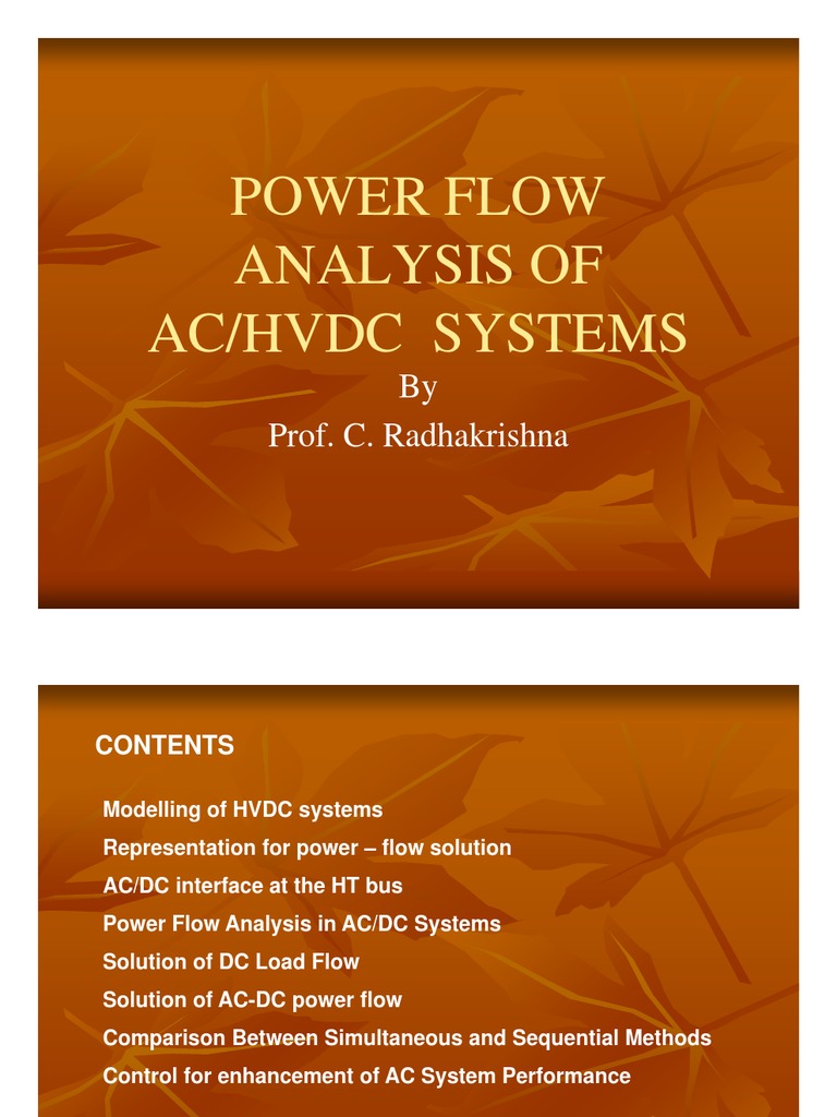 Modelling of HVDC systems Representation for power flow solution AC/DC interface at the HT bus Power Flow Analysis in AC/DC Systems Solution of DC Load Flow Solution of AC-DC power flow Comparison Between Simultaneous and Sequential Methods Control for enhancement of AC System Performance