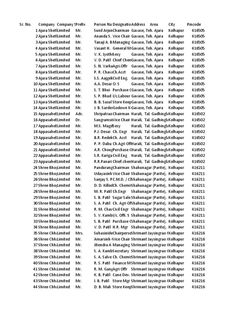 34 Shree BhogLimited Mr. V. D. Patil H.R. Mgr Shahunagar (Parite), Kolhapur 416211