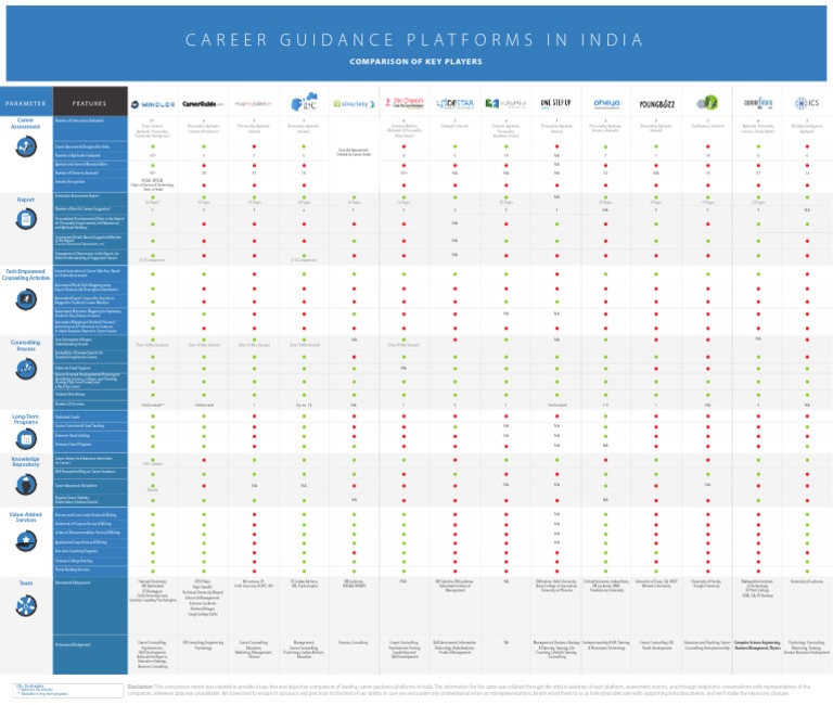 NA = Not Available Disclaimer: This comparison report was created to provide a bias-free and objective comparison of leading career-guidance platforms in India. The information for the same was collated through the official websites of each platform, assessment reports, and through telephonic conversations with representatives of the