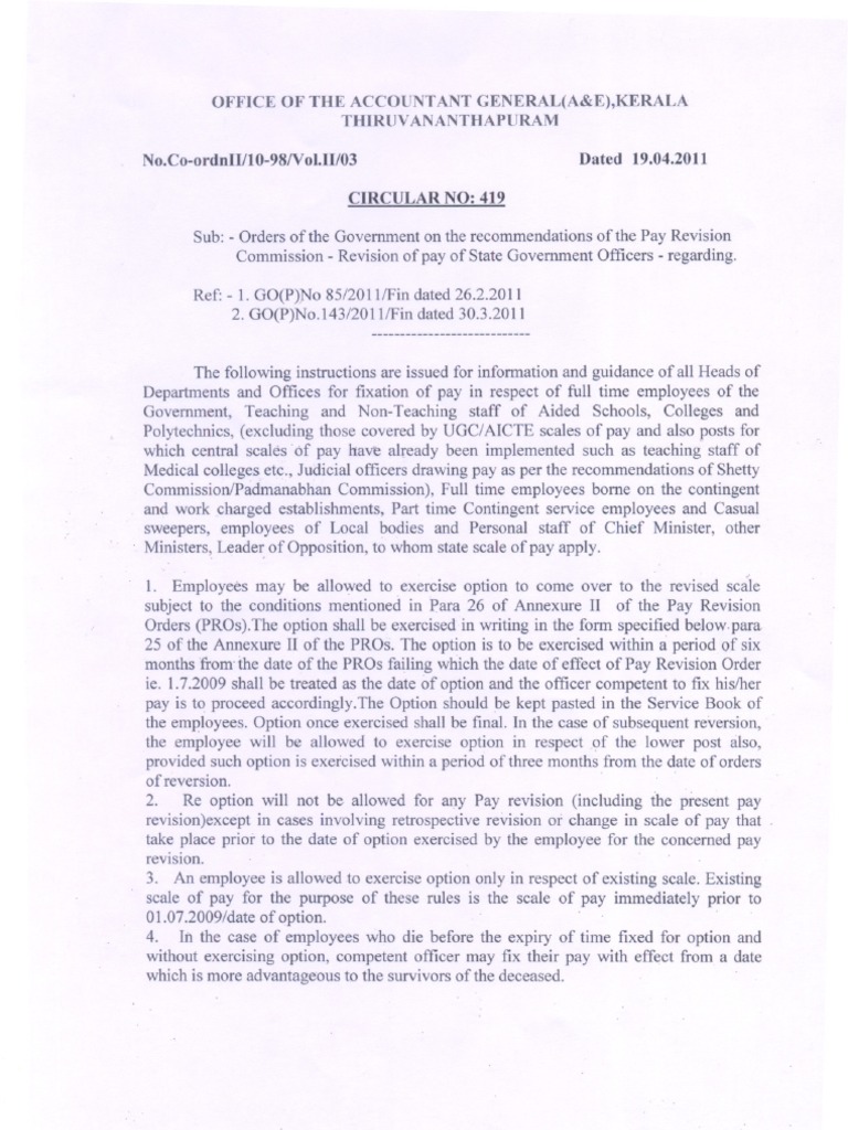 11/03 CIRCULAR NO: 419 Sub: - Orders of the Government on the recommendations of the Pay Revision Commission - Revision of pay of State Government Officers - regarding. Ref: - 1. GO(P)No 85/2011/Fin dated 26.2.2011 2. GO(P)No.143/2011/Fin dated 30.3.2011