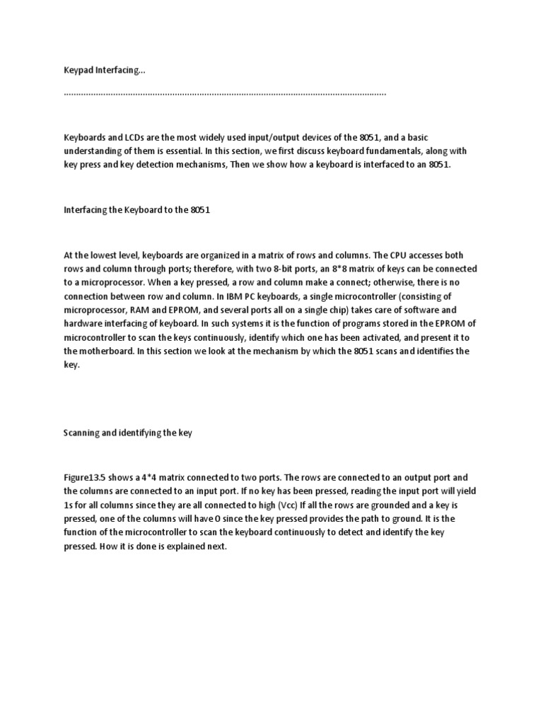 At the lowest level, keyboards are organized in a matrix of rows and columns. The CPU accesses both rows and column through ports; therefore, with two 8-bit ports, an 8*8 matrix of keys can be connected to a microprocessor. When a key pressed, a row and column make a connect; otherwise, there is no connection between row and column. In IBM PC keyboards, a single microcontroller (consisting of microprocessor, RAM and EPROM, and several ports all on a single chip) takes care of software and hardware interfacing of keyboard. In such systems it is the function of programs stored in the EPROM of microcontroller to scan the keys continuously, identify which one has been activated, and present it to the motherboard. In this section we look at the mechanism by which the 8051 scans and identifies the key.