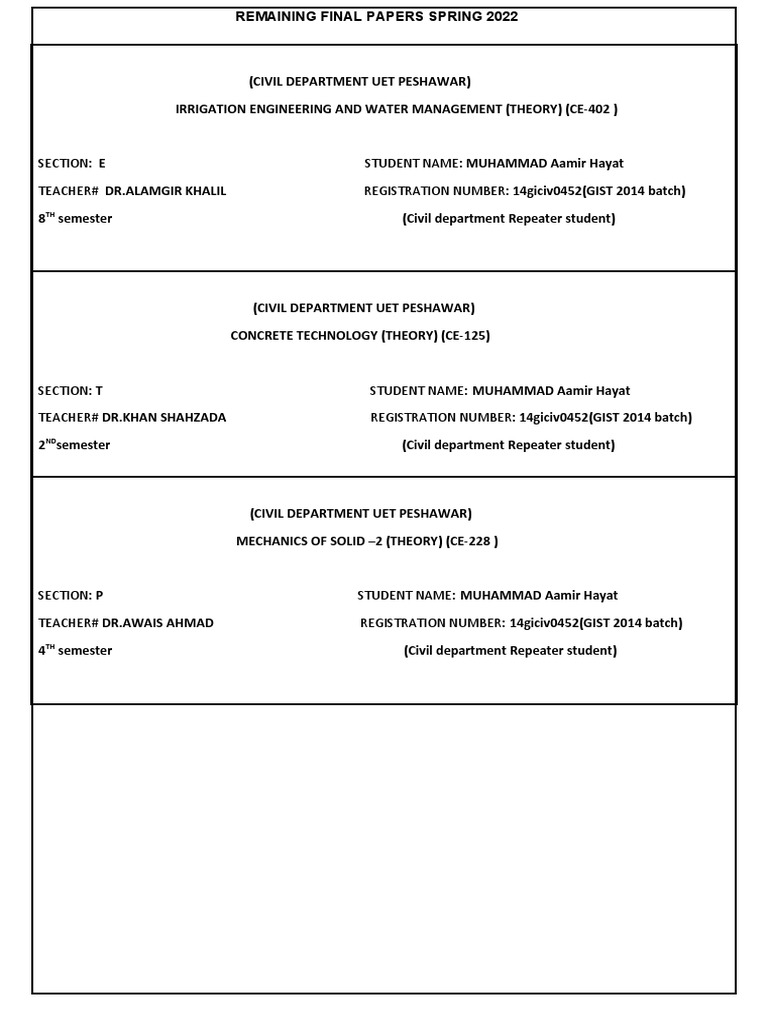 The document lists remaining final papers for a civil engineering student at UET Peshawar including courses on Irrigation Engineering and Water Management, Concrete Technology, and Mechanics of Solid - 2. It provides the course codes, names, sections, teachers, and student details for each paper.