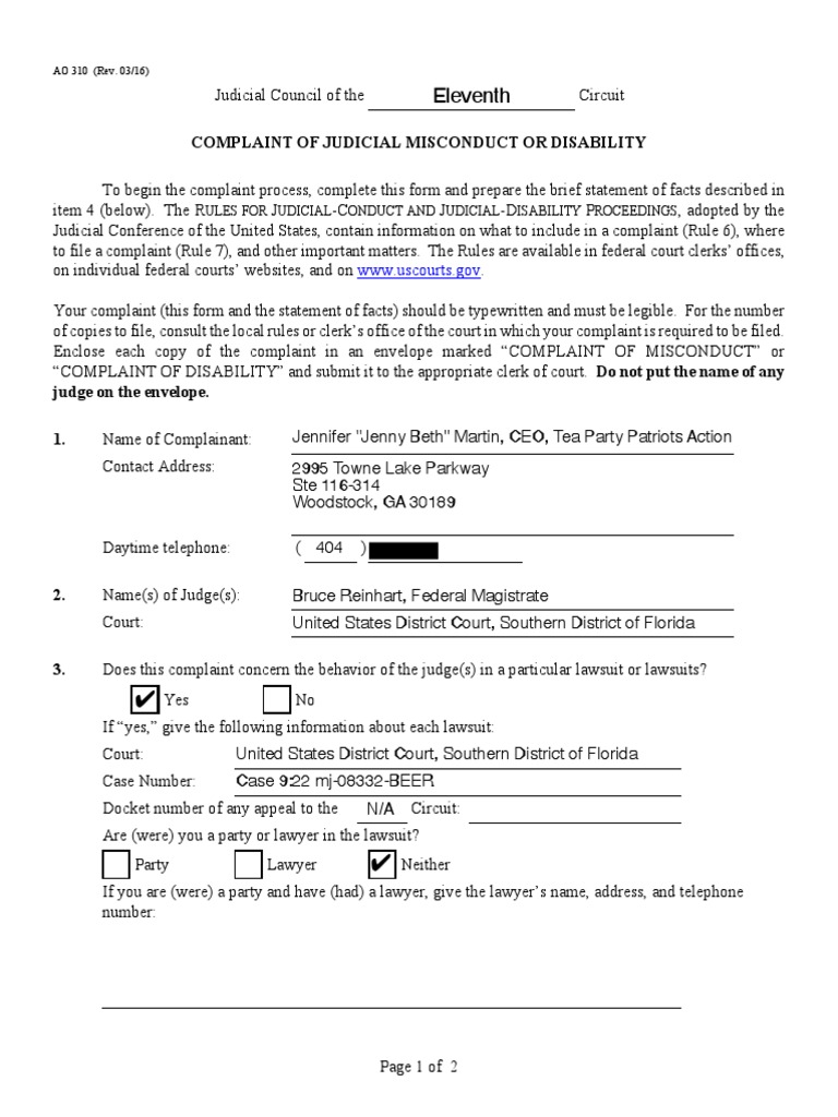 1. Name of Complainant: Jennifer "Jenny Beth" Martin, CEO, Tea Party Patriots Action