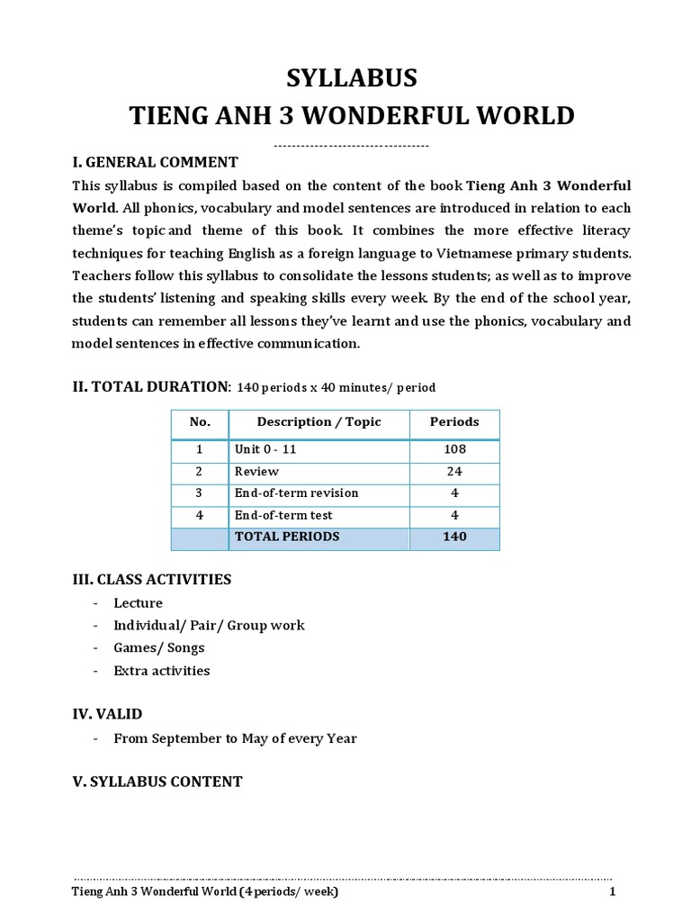 This syllabus is compiled based on the content of the book Tieng Anh 3 Wonderful