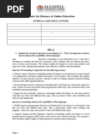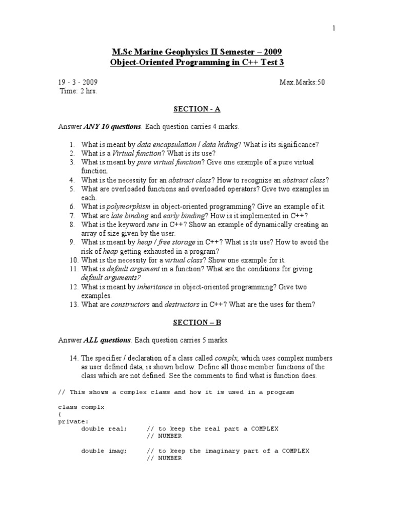 19 - 3 - 2009 Time: 2 hrs. SECTION - A Answer ANY 10 questions. Each question carries 4 marks. 1. What is meant by data encapsulation / data hiding? What is its significance? 2. What is a Virtual function? What is its use? 3. What is meant by pure virtual function? Give one example of a pure virtual function. 4. What is the necessity for an abstract class? How to recognize an abstract class? 5. What are overloaded functions and overloaded operators? Give two examples in each. 6. What is polymorphism in object-oriented programming? Give an example of it. 7. What are late binding and early binding? How is it implemented in C++? 8. What is the keyword new in C++? Show an example of dynamically creating an array of size given by the user. 9. What is meant by heap / free storage in C++? What is its use? How to avoid the risk of heap getting exhausted in a program? 10. What is the necessity for a virtual class? Show one example for it. 11. What is default argument in a function? What are the conditions for giving default arguments? 12. What is meant by inheritance in object-oriented programming? Give two examples. 13. What are constructors and destructors in C++? What are the uses for them? SECTION B Answer ALL questions. Each question carries 5 marks. 14. The specifier / declaration of a class called complx, which uses complex numbers as user defined data, is shown below. Define all those member functions of the class which are not defined. See the comments to find what is function does.