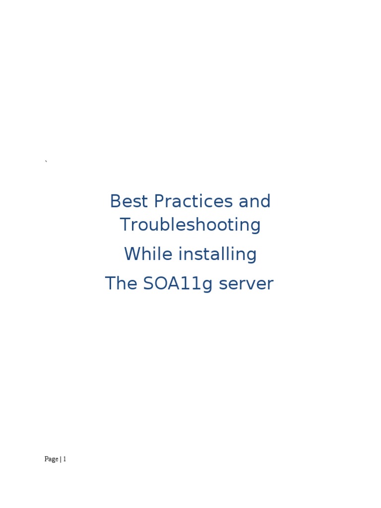 1 Introduction............................................................................................................. 3 1.1 Order Of Installation Tasks................................................................................3 2 Step 1 : Preparing to Install.....................................................................................4 2.1 System Requirements.......................................................................................4 2.2 Install Database................................................................................................ 4 2.2.1 Steps to Install Database (Oracle Database 10g Express Edition)...............4 3 Step 2 : Create Schemas using RCU........................................................................8 3.1 Steps to Create Schemas..................................................................................8 4 Step 3 : Install the Oracle WebLogic Server...........................................................21 4.1 Steps to Install WebLogic Server.....................................................................22 5 Step 4 : Install Oracle SOA Suite............................................................................31 5.1 Steps to Install Oracle SOA Suite (11.1.1.2.0).................................................32 6 Step 5 : Apply the Patch Set (11.1.1.3.0)...............................................................38 6.1 Steps to run Patch Set Installer.......................................................................38 7 Step 6 : Create WebLogic Domain and Configure Oracle SOA Suite......................42 7.1 Steps to Create WebLogic Domain and Configure SOA Suite..........................42 8 Post-Installation tasks............................................................................................51 8.1 Launching the Server......................................................................................51 8.2 Verify the Installation......................................................................................52 SOA Suite 11g: Unable to start domain (Error occurred during initialization of VM) 52