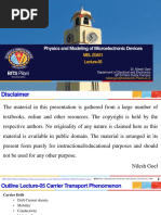 Threshold depends on L, W and VDS Due to depletion regions of the source and reversebiased drain junction. Drain-induced barrier lowering (DIBL) : Vth0 decreases with increasing VDS . Very high drain voltage source and drain depletion regions may get shorted (punch-through) Narrow channel effects: Vth0 increases since depletion regions does not abruptly stops at the edges of the transistors but extends to isolating field oxide regions. Gate voltage must support the extra depletion charge to establish conducting channel.