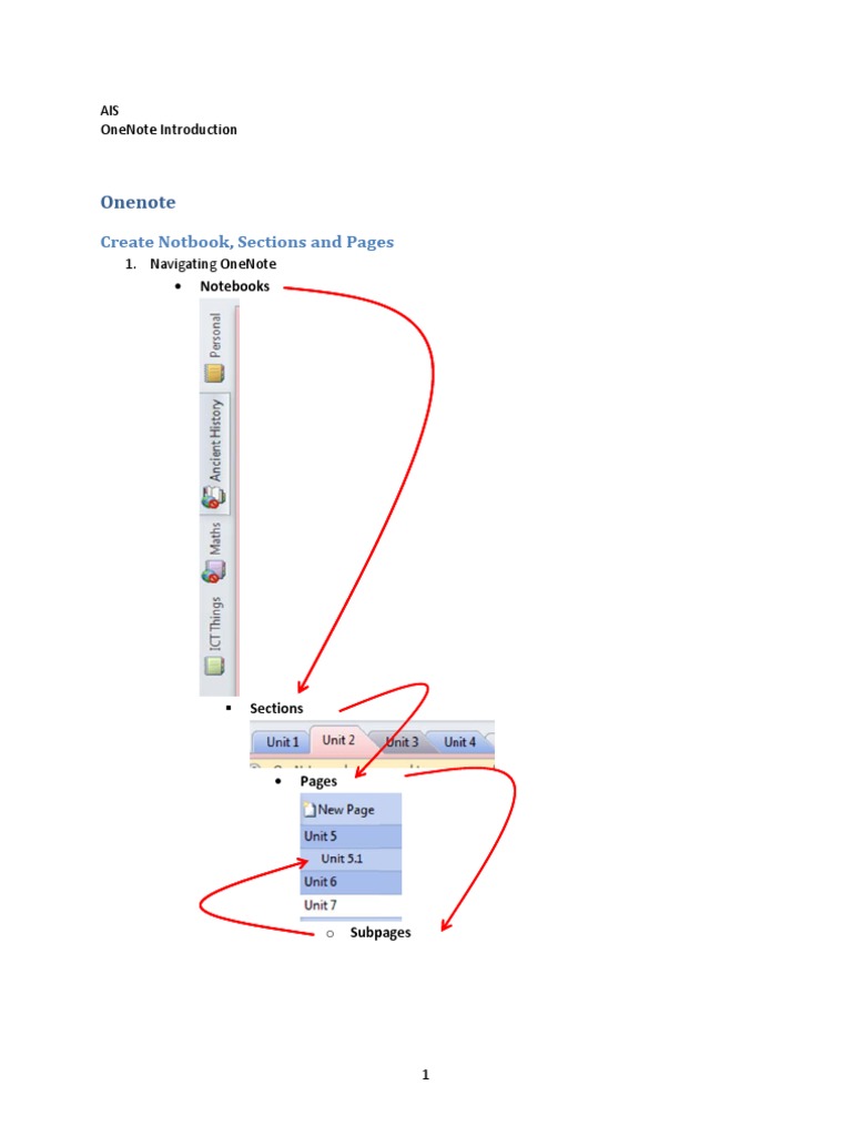 AIS eIntroductio on OneNote Createsubpa ages 11. C Clickand ddragtosetindent Clickand ddragtosetpageorder Rightclic ckdelete 12. T Toaddanew wsection,clic ckonthenew wtab