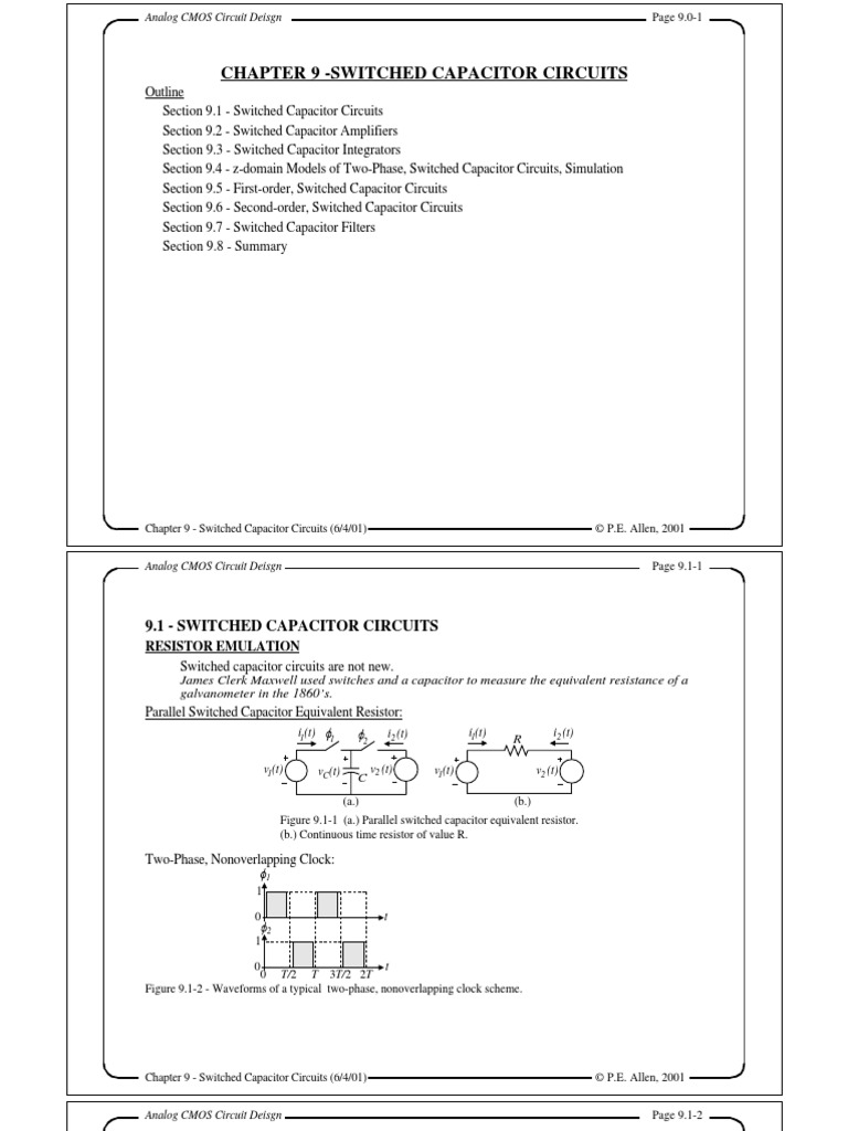 EXAMPLE 9.1-3 - Analysis of a Switched Capacitor, First-order, Low pass Filter Use the above approach to find the z-domain transfer function of the first-order, low pass switched capacitor circuit shown below. This circuit was developed by replacing the resistor, R1, of the previous circuit with the parallel switched capacitor resistor circuit. The timing of the clocks is also shown. This timing is arbitrary and is used to assist the analysis and does not change the result.