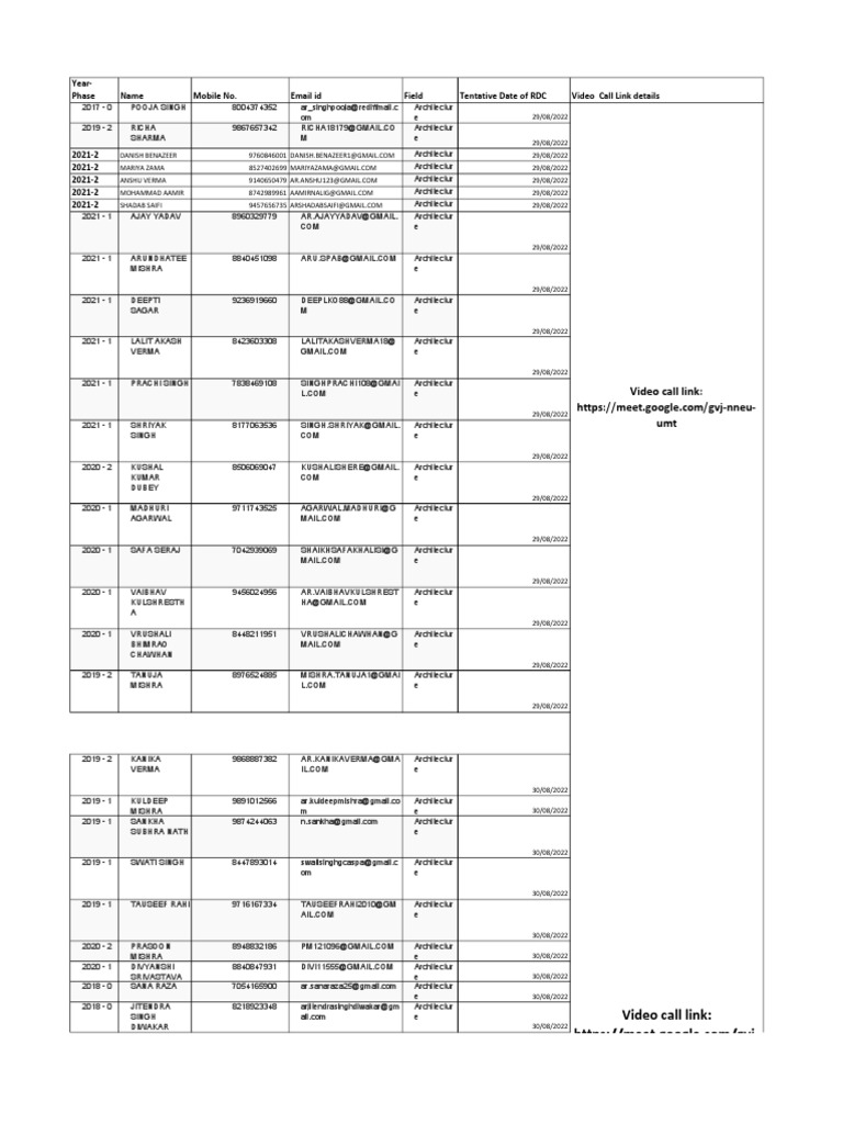 Phase Name Mobile No. Email id Field Tentative Date of RDC Video Call Link details