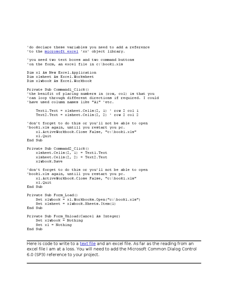 'you need two text boxes and two command buttons 'on the form, an excel file in c:\book1.xls Dim xl As New Excel.Application Dim xlsheet As Excel.Worksheet Dim xlwbook As Excel.Workbook Private Sub Command1_Click() 'the benifit of placing numbers in (row, col) is that you 'can loop through different directions if required. I could 'have used column names like "A1" 'etc. Text1.Text = xlsheet.Cells(2, 1) ' row 2 col 1 Text2.Text = xlsheet.Cells(2, 2) ' row 2 col 2 'don't forget to do this or you'll not be able to open 'book1.xls again, untill you restart you pc. xl.ActiveWorkbook.Close False, "c:\book1.xls" xl.Quit End Sub Private Sub Command2_Click() xlsheet.Cells(2, 1) = Text1.Text xlsheet.Cells(2, 2) = Text2.Text xlwbook.Save 'don't forget to do this or you'll not be able to open 'book1.xls again, untill you restart you pc. xl.ActiveWorkbook.Close False, "c:\book1.xls" xl.Quit End Sub Private Sub Form_Load() Set xlwbook = xl.Workbooks.Open("c:\book1.xls") Set xlsheet = xlwbook.Sheets.Item(1) End Sub Private Sub Form_Unload(Cancel As Integer) Set xlwbook = Nothing Set xl = Nothing End Sub