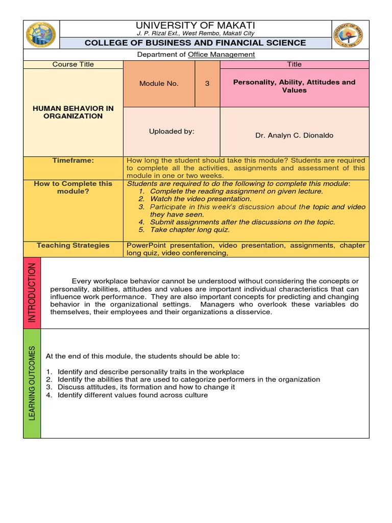 PERSONALITY, ABILITY, ATTITUDES AND VALUES