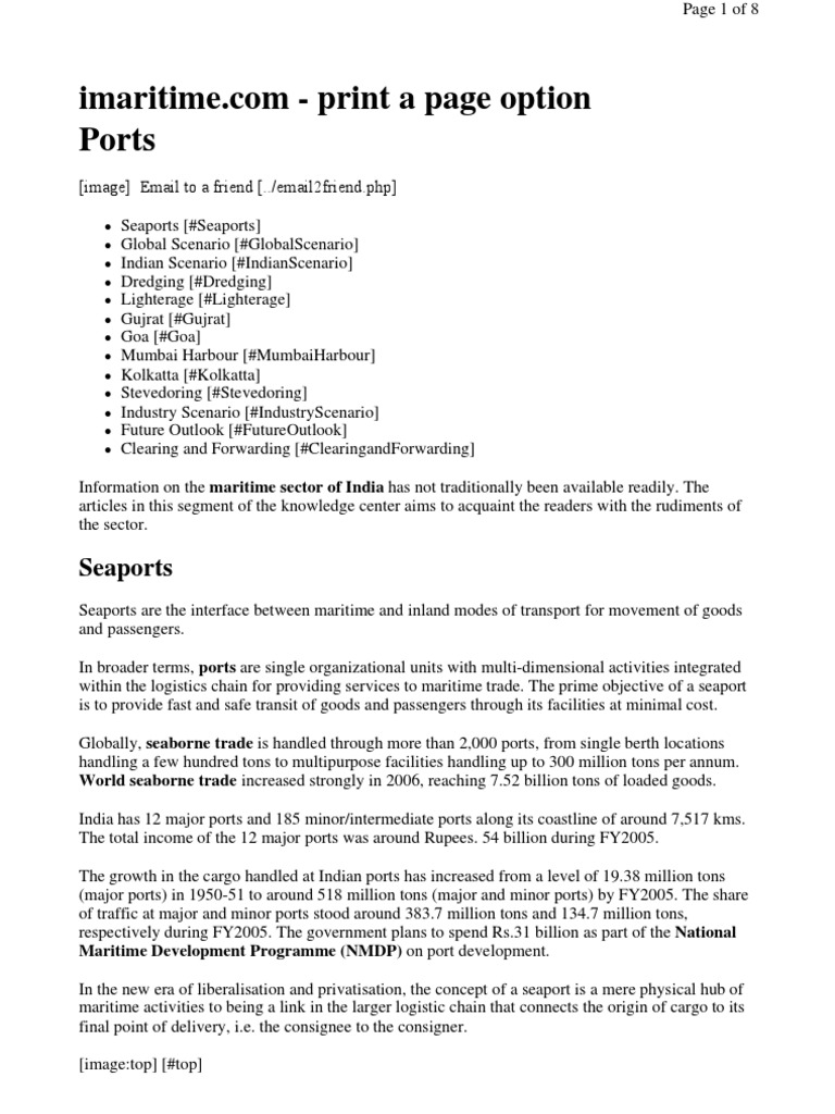 Seaports are the interface between maritime and inland modes of transport for movement of goods and passengers. In broader terms, ports are single organizational units with multi-dimensional activities integrated within the logistics chain for providing services to maritime trade. The prime objective of a seaport is to provide fast and safe transit of goods and passengers through its facilities at minimal cost. Globally, seaborne trade is handled through more than 2,000 ports, from single berth locations handling a few hundred tons to multipurpose facilities handling up to 300 million tons per annum. World seaborne trade increased strongly in 2006, reaching 7.52 billion tons of loaded goods. India has 12 major ports and 185 minor/intermediate ports along its coastline of around 7,517 kms. The total income of the 12 major ports was around Rupees. 54 billion during FY2005. The growth in the cargo handled at Indian ports has increased from a level of 19.38 million tons (major ports) in 1950-51 to around 518 million tons (major and minor ports) by FY2005. The share of traffic at major and minor ports stood around 383.7 million tons and 134.7 million tons, respectively during FY2005. The government plans to spend Rs.31 billion as part of the National Maritime Development Programme (NMDP) on port development. In the new era of liberalisation and privatisation, the concept of a seaport is a mere physical hub of maritime activities to being a link in the larger logistic chain that connects the origin of cargo to its final point of delivery, i.e. the consignee to the consigner. [image:top] [#top]