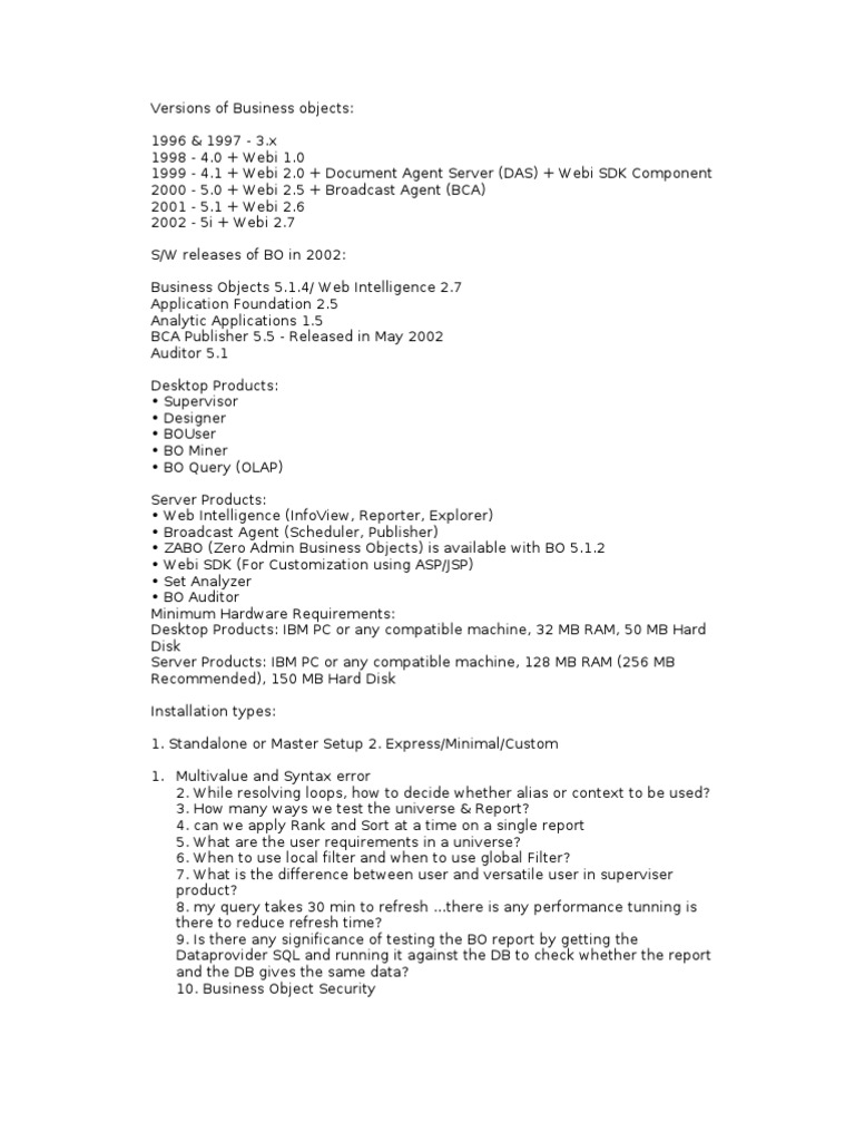 S/W releases of BO in 2002: Business Objects 5.1.4/ Web Intelligence 2.7 Application Foundation 2.5 Analytic Applications 1.5 BCA Publisher 5.5 - Released in May 2002 Auditor 5.1 Desktop Products: Supervisor Designer BOUser BO Miner BO Query (OLAP) Server Products: Web Intelligence (InfoView, Reporter, Explorer) Broadcast Agent (Scheduler, Publisher) ZABO (Zero Admin Business Objects) is available with BO 5.1.2 Webi SDK (For Customization using ASP/JSP) Set Analyzer BO Auditor Minimum Hardware Requirements: Desktop Products: IBM PC or any compatible machine, 32 MB RAM, 50 MB Hard Disk Server Products: IBM PC or any compatible machine, 128 MB RAM (256 MB Recommended), 150 MB Hard Disk Installation types: 1. Standalone or Master Setup 2. Express/Minimal/Custom 1. Multivalue and Syntax error 2. While resolving loops, how to decide whether alias or context to be used? 3. How many ways we test the universe & Report? 4. can we apply Rank and Sort at a time on a single report 5. What are the user requirements in a universe? 6. When to use local filter and when to use global Filter? 7. What is the difference between user and versatile user in superviser product? 8. my query takes 30 min to refresh ...there is any performance tunning is there to reduce refresh time? 9. Is there any significance of testing the BO report by getting the Dataprovider SQL and running it against the DB to check whether the report and the DB gives the same data? 10. Business Object Security