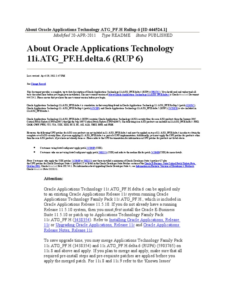 Attention: Oracle Applications Technology 11i.ATG_PF.H.delta.6 can be applied only to an existing Oracle Applications Release 11i system running Oracle Applications Technology Family Pack 11i.ATG_PF.H , which is included in Oracle Applications Release 11.5.10. If you do not already have a running Release 11.5.10 system, then you must first install the Oracle E-Business Suite 11.5.10 or patch up to Applications Technology Family Pack 11i.ATG_PF.H (3438354). Refer to Installing Oracle Applications, Release 11i or Upgrading Oracle Applications, Release 11i and Oracle Applications Release Notes, Release 11i. To save upgrade time, you may merge Applications Technology Family Pack 11i.ATG_PF.H (3438354) and 11i.ATG_PF.H.delta.6 (RUP6) (5903765) on 11i.8 and above and apply. If you plan to merge and apply, make sure that all required pre-install steps and pre-requisite patches are applied before you apply the merged patch. For 11i.8 and 11i.9 refer to the 'Known Issues'
