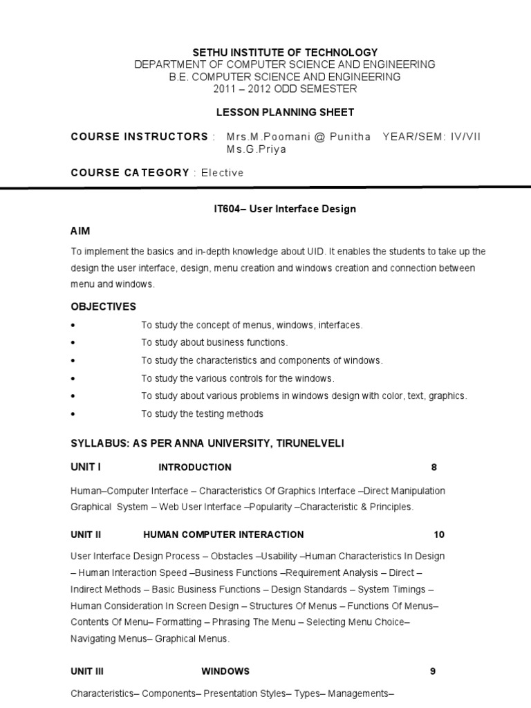 COMPUTER SCIENCE AND ENGINEERING 2011 2012 ODD SEMESTER LESSON PLANNING SHEET COURSE INSTRUCTORS : Mrs.M.Poomani @ Punitha Ms.G.Priya YEAR/SEM: IV/VII