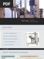 1. General overview - Scope - Reservoir fluids properties - Phase Behavior 2. Sampling - Well conditioning - Bottomhole sampling - Separator Sampling 3. Samples Validation - Opening pressures, volume measurement, free water/mud checks - Compositional analysis - Bubble point/dew point measurements 4. Samples Recombination - Separator parameters corrected for lab conditions 5. Selection of PVT analyses to perform - Fluids description - liquid content, GOR, API 6. Flash Separation - Ambient and elevated temperature flash - Mathematical recombination of flashed fractions 7. Reservoir Conditions Analysis - Constant Composition Expansion - Differential Vaporisation - Constant Volume Depletion - Single and Multistage Separator Tests - "Live" Viscosity Measurements - Bubble point/dew point measurements 8. Physical Properties Measurements - Density - Mole Weights - Gas Composition - Liquid Composition