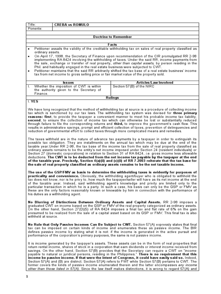 implementing RA 8424 involving the withholding of taxes. Under the said RR, income payments from