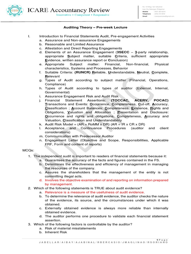 I. Introduction to Financial Statements Audit, Pre-engagement Activities