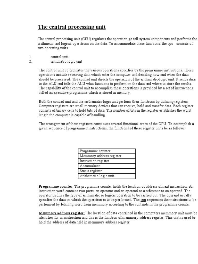 The central processing unit (CPU) regulates the operation go tall system components and performs the arithmetic and logical operations on the data. To accommodate these functions, the cpu consists of two operating units. 1. 2. control unit arithmetic-logic unit The control unit co ordinates the various operations specifies by the programme instructions. These operations include receiving data which enter the computer and deciding how and when the data should be processed. The control unit directs the operation of the arithematic-logic unit. It sends data to the ALU and tells the ALU what functions to perform on the data and where to store the results. The capability of the control unit to accomplish these operations is provided by a set of instructions called an executive programme which is stored in memory. Both the control unit and the arithematic-logic unit perform their functions by utilizing registers. Computer registers are small memory devices that can receive, hold and transfer data. Each register consists of binary cells to hold bits of data. The number of bits in the register establishes the word length the computer is capable of handling. The arrangement of these registers constitutes several functional areas of the CPU. To accomplish a given sequence of programmed instructions, the functions of these register units be as follows