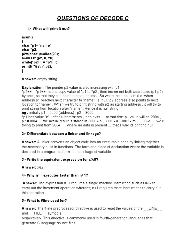 1> What will print it out? main() { char *p1=name; char *p2; p2=(char*)malloc(20); memset (p2, 0, 20); while(*p2++ = *p1++); printf(%s\n,p2); } Answer: empty string. Explanation: The pointer p2 value is also increasing with p1 . *p2++ = *p1++ means copy value of *p1 to *p2 , then increment both addresses (p1,p2) by one , so that they can point to next address . So when the loop exits (i.e. when address p1 reaches next character to name i.e. null) p2 address also points to next location to name . When we try to print string with p2 as starting address , it will try to print string from location after name . Hence it is null string. eg : initially p1 = 2000 (address) , p2 = 3000 *p1 has value n ..after 4 increments , loop exits at that time p1 value will be 2004 , p2 =3004 the actual result is stored in 3000 - n , 3001 - a , 3002 - m , 3003 -e we r trying to print from 3004 . where no data is present thats why its printing null . 2> Differentiate between a linker and linkage? Answer: A linker converts an object code into an executable code by linking together the necessary build in functions. The form and place of declaration where the variable is declared in a program determine the linkage of variable. 3> Write the equivalent expression for x%8? Answer: x&7 4> Why n++ executes faster than n+1? Answer: The expression n++ requires a single machine instruction such as INR to carry out the increment operation whereas; n+1 requires more instructions to carry out this operation. 5> What is #line used for? Answer: The #line preprocessor directive is used to reset the values of the _ _LINE_ _ and _ _FILE_ _ symbols, respectively. This directive is commonly used in fourth-generation languages that generate C language source files.