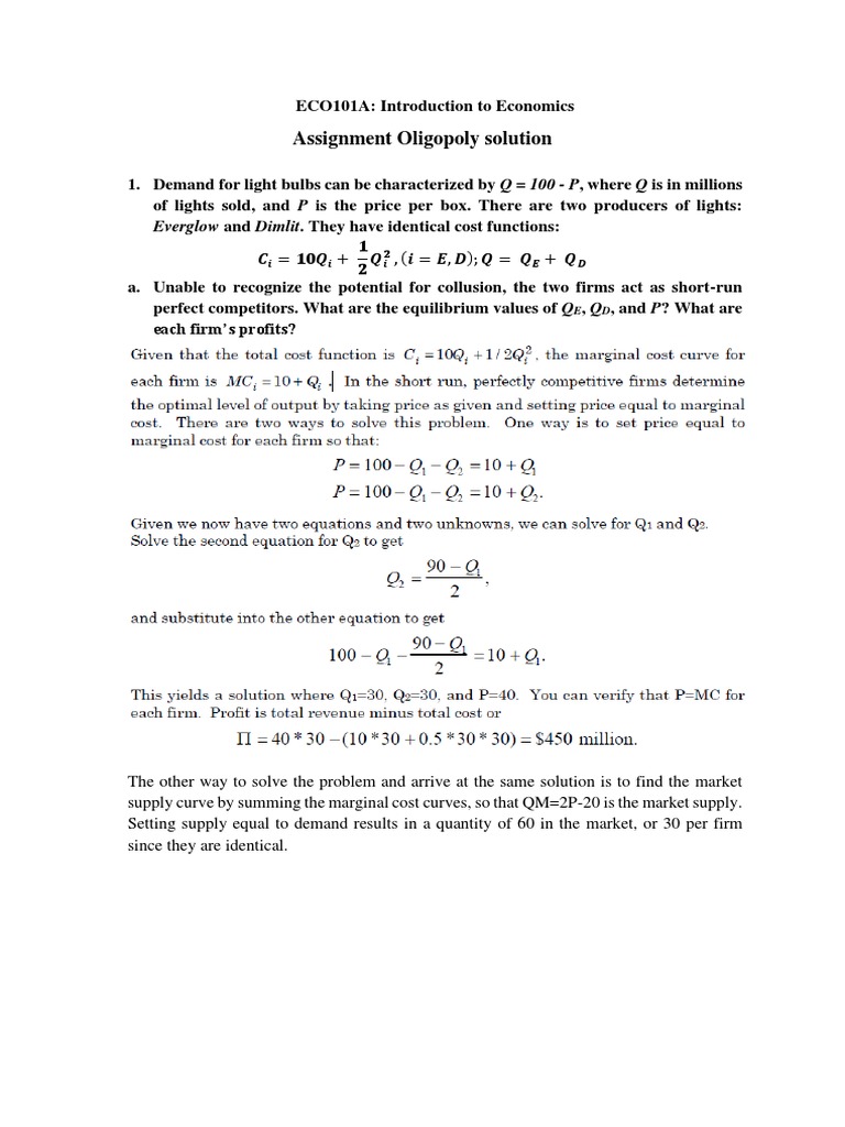 1. Demand for light bulbs can be characterized by Q = 100 - P, where Q is in millions