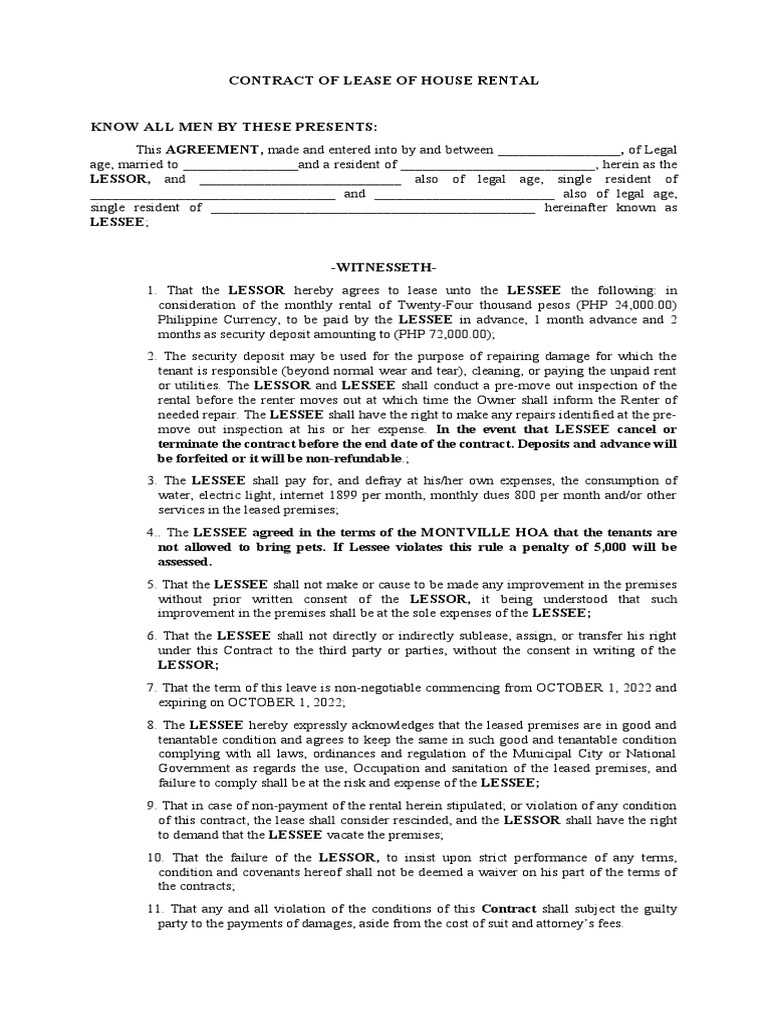CONTRACT OF LEASE OF HOUSE RENTAL