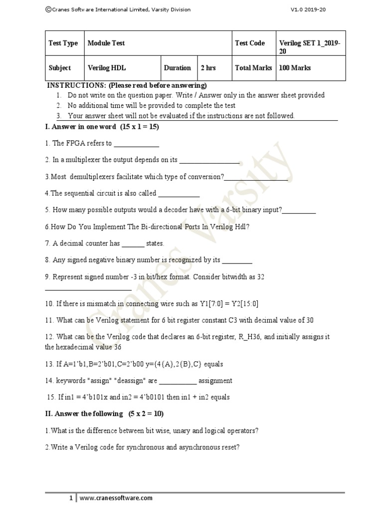 Subject Verilog HDL Duration 2 hrs Total Marks 100 Marks