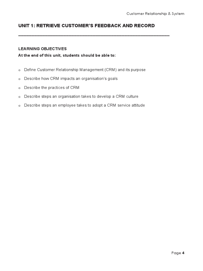 UNIT 1: RETRIEVE CUSTOMER’S FEEDBACK AND RECORD