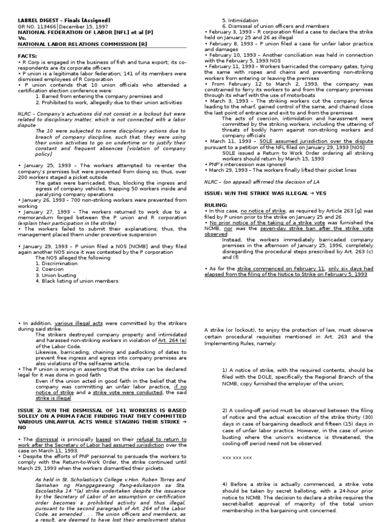 NATIONAL FEDERATION OF LABOR [NFL] et al [P] • February 3, 1993 – R corporation filed a case to declare the strike