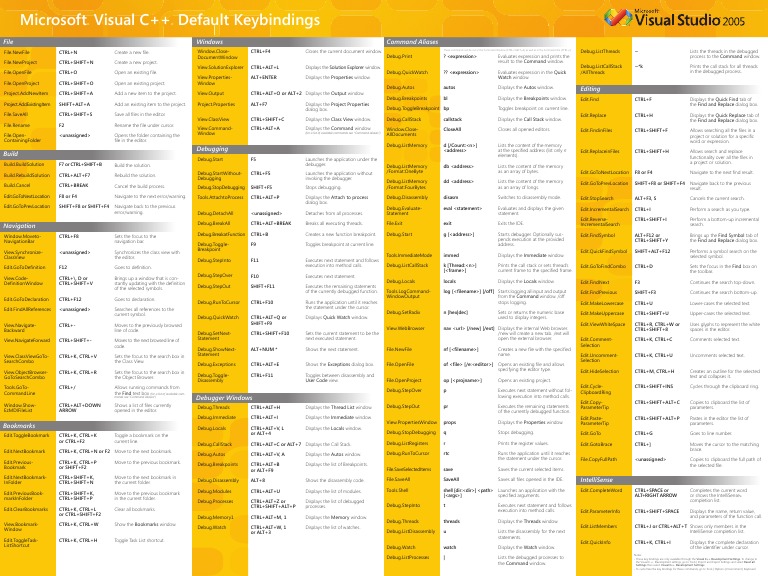 Debug.Start Debug.StartWithoutDebugging Debug.StopDebugging Tools.AttachtoProcess Debug.DetachAll Debug.BreakAll CTRL+F8 <unassigned> F12 CTRL+\, D or CTRL+SHIFT+V CTRL+F12 <unassigned> CTRL+CTRL+SHIFT+CTRL+K, CTRL+V CTRL+K, CTRL+R CTRL+/ CTRL+ALT+DOWN ARROW Sets the focus to the navigation bar. Synchronizes the class view with the editor. Goes to denition. Brings up a window that is constantly updating with the denition of the selected symbols. Goes to declaration. Searches all references to the current symbol. Moves to the previously browsed line of code. Moves to the next browsed line of code. Sets the focus to the search box in the Class View. Sets the focus to the search box in the Object Browser. Allows running commands from the Find text box (for a list of available commands see Command Aliases)
