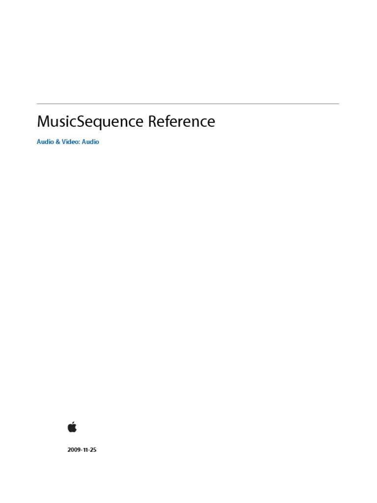Overview 5 Functions by Task 5 Creating and Configuring Music Sequences 5 Working with Music Tracks 6 Working With Audio Processing Graphs and MIDI Endpoints 6 Working With Time 6 Working With Files 7 Functions 7 DisposeMusicSequence 7 MusicSequenceBarBeatTimeToBeats 8 MusicSequenceBeatsToBarBeatTime 8 MusicSequenceDisposeTrack 9 MusicSequenceFileCreate 10 MusicSequenceFileCreateData 11 MusicSequenceFileLoad 12 MusicSequenceFileLoadData 12 MusicSequenceGetAUGraph 13 MusicSequenceGetBeatsForSeconds 14 MusicSequenceGetIndTrack 15 MusicSequenceGetInfoDictionary 15 MusicSequenceGetSecondsForBeats 16 MusicSequenceGetSequenceType 16 MusicSequenceGetSMPTEResolution 17 MusicSequenceGetTempoTrack 17 MusicSequenceGetTrackCount 18 MusicSequenceGetTrackIndex 19 MusicSequenceNewTrack 19 MusicSequenceReverse 20 MusicSequenceSetAUGraph 20 MusicSequenceSetMIDIEndpoint 21 MusicSequenceSetSequenceType 21 MusicSequenceSetSMPTEResolution 22 MusicSequenceSetUserCallback 23 NewMusicSequence 23 Callbacks 24 MusicSequenceUserCallback 24 Data Types 25 MusicSequence 25 MusicTimeStamp 25 Constants 25