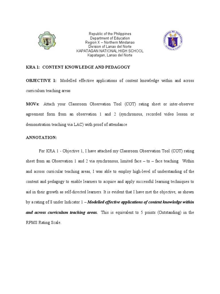 For KRA 1 - Objective 1, I have attached my Classroom Observation Tool (COT) rating