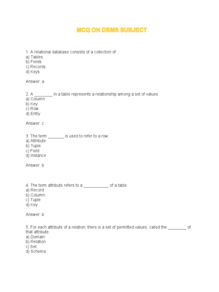 5. For each attribute of a relation, there is a set of permitted values, called the ________ of