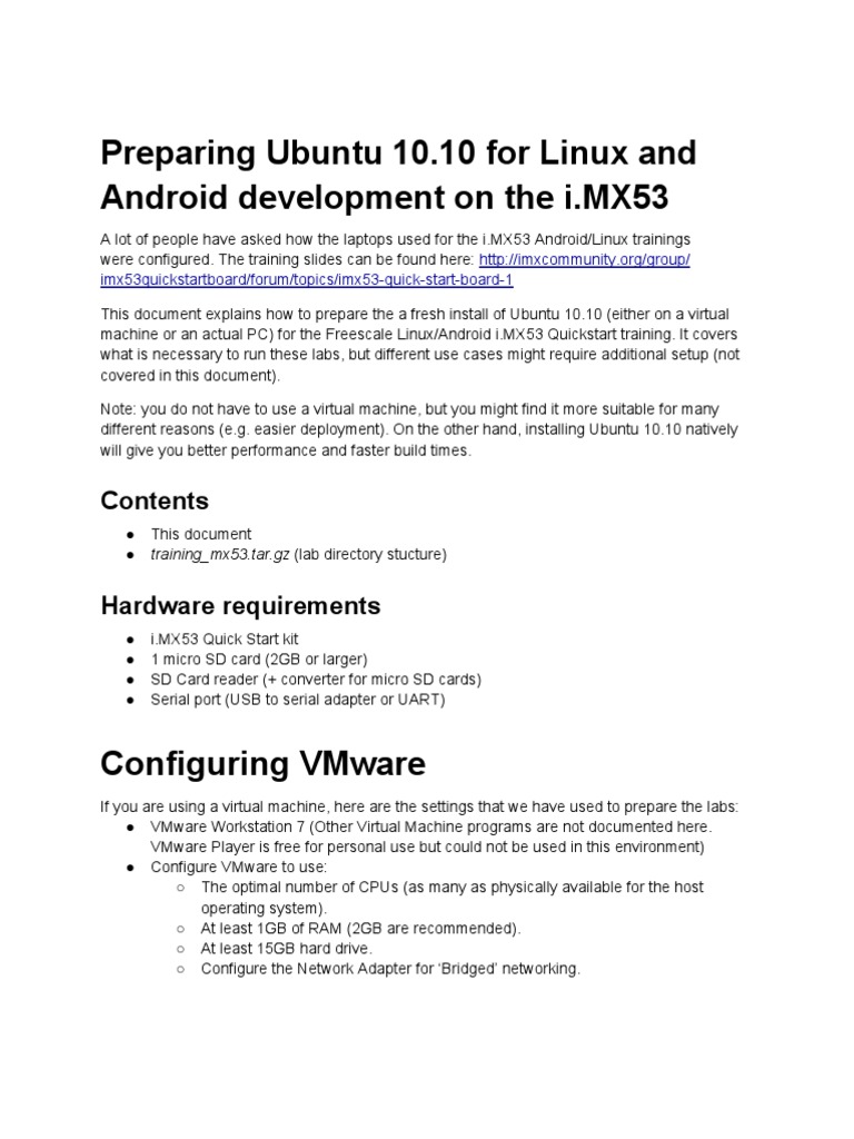 A lot of people have asked how the laptops used for the i.MX53 Android/Linux trainings were configured. The training slides can be found here: http://imxcommunity.org/group/ imx53quickstartboard/forum/topics/imx53-quick-start-board-1 This document explains how to prepare the a fresh install of Ubuntu 10.10 (either on a virtual machine or an actual PC) for the Freescale Linux/Android i.MX53 Quickstart training. It covers what is necessary to run these labs, but different use cases might require additional setup (not covered in this document). Note: you do not have to use a virtual machine, but you might find it more suitable for many different reasons (e.g. easier deployment). On the other hand, installing Ubuntu 10.10 natively will give you better performance and faster build times.