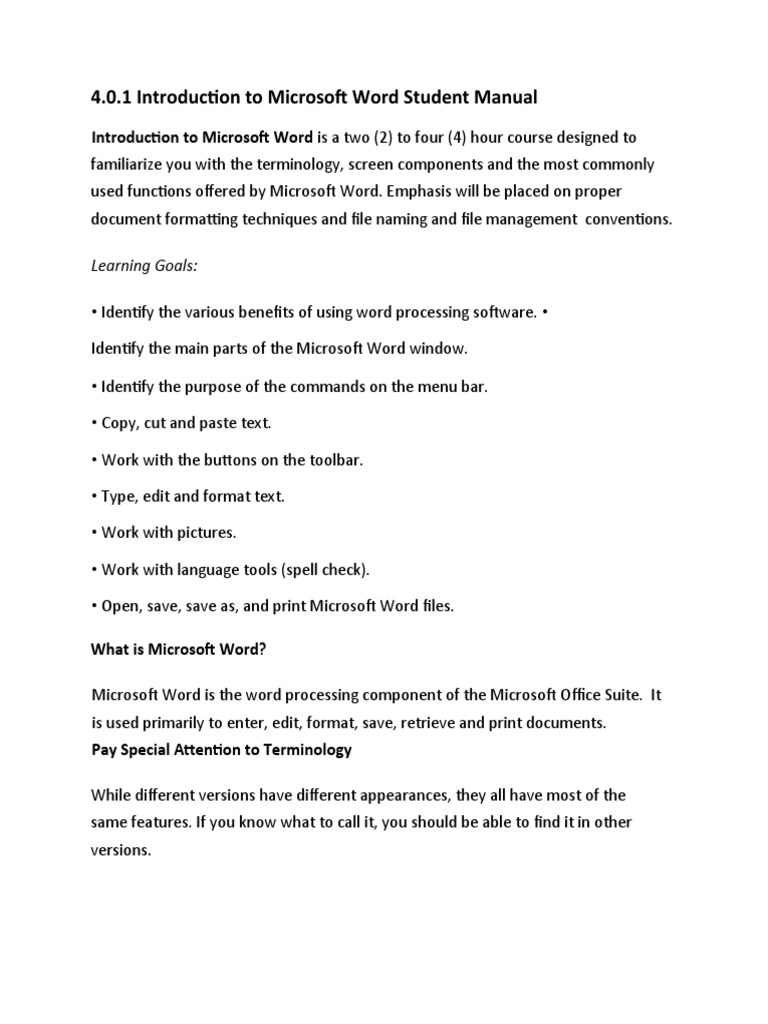 Introduction to Microsoft Word is a two (2) to four (4) hour course designed to