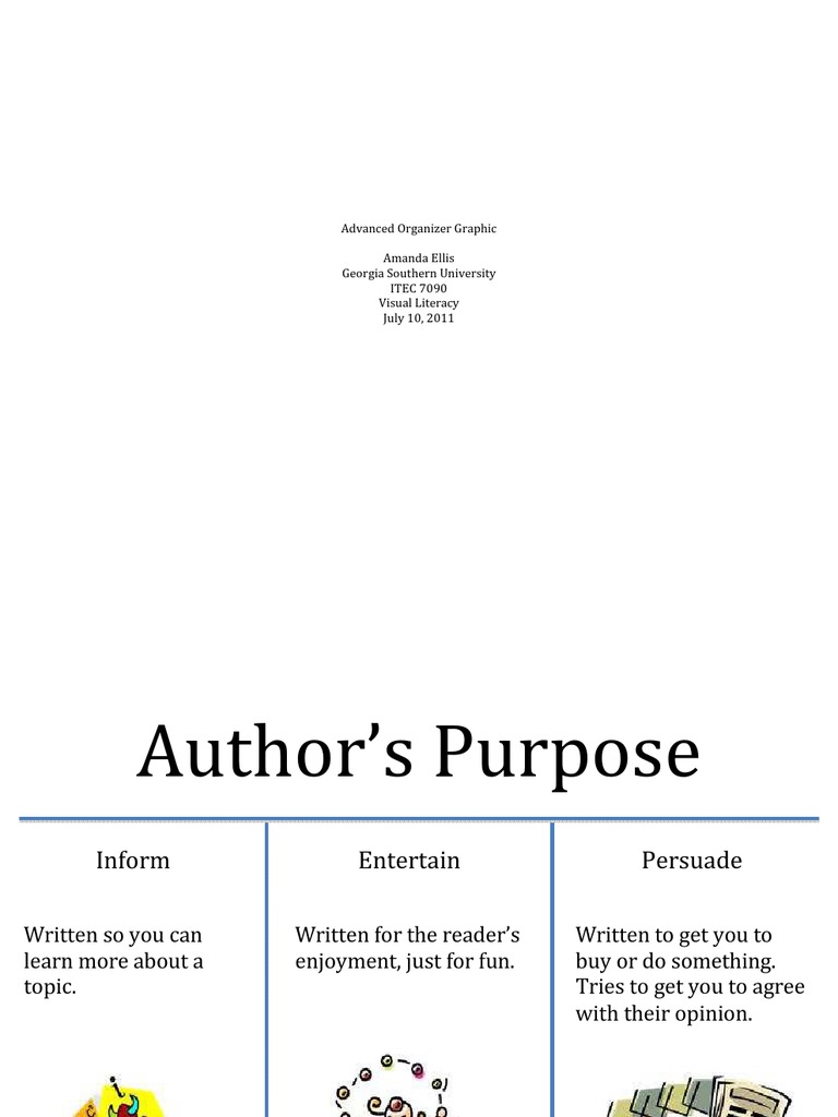 Audience:My third grade reading students of different ability levels. This class also contains three ESOL students. I chose to create an advanced organizer that shows the parts to whole relationship using author s purpose. Author s purpose is a third grade standard that I will be teaching this upcoming school year. The parts to whole relationship emphasized in this advanced organizer are author s purpose to the three purposes taught. Inform, entertain, and persuade are the parts to their whole, author s purpose. In our textbook, Creating Graphics for Learning and Performance: Lessons in Visual Literacy, Lohr (2008) describes gestalt as a principle of perception that states the whole is greater than the sum of its parts (p. 158). I created gestalt in my advanced organizer by using the gestalt principles of proximity and previous experience. According to Lohr (2008), proximity is when the mind groups elements based on their closeness (p. 167). As you look at each of the author s purposes, the words and pictures are grouped together. I wanted students to understand that the word, definition, and pictures all represent the one purpose. Placing them close is a more effective way for students to understand that they go together than placing them far apart. Also, the three purposes are placed under, but still close to the words Author s Purpose for optimal proximity. Lohr (2008) states that using proximity can make instructional information easier to understand (p. 168). The other principle of gestalt used in my advanced organizer is previous experience. The pictures I used to represent each of the author s purposes are based on a student s previous experiences. The purpose to inform is represented by a book that would be interpreted as a school textbook or encyclopedia based on students previous experiences with school textbooks. The picture that represents the word entertain is a clown juggling. Students would recognize a clown juggling as something done for fun or enjoyment. The picture representation for the word persuade is a newsstand man selling newspapers. Based on previous experience students would see the man trying to get you to buy a newspaper, which is also full of persuasive ads and articles. Lohr (2008) explains that you can increase the ability to keep information alive in short-term memory by associating that information with what the learner already knows (p. 168). Students will be able to understand and remember author s purpose by linking the pictures their previous experiences. My goal is by using the gestalt principles of proximity and previous experience, students will be able to use my advanced organizer to understand and apply author s purpose to what they read in class. User Test: I showed this to two female middle school students. They thought that it was easy to understand, but both suggested a change. They suggested the picture for persuade needed to be changed to something that was easier to understand that the image was persuading. Based on my previous experience, the persuasive affect of this picture is obvious; however, I could see how this could be hard to understand for younger students in rural, south Georgia where there are no newsstands. Changes: I will change the picture for persuade to a picture of a billboard or advertisement in order for students to make a link to their previous experiences.