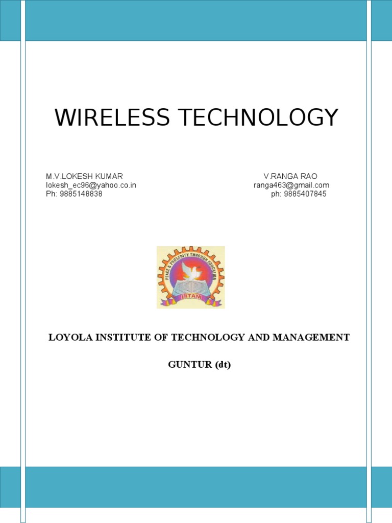 The World becomes silent with out the word wireless technologies. The statement is not an exaggeration but mere indication of the facts in the present generation. The word wireless became an integral part to all most all the people in the 20th century, now-a-days a student from a remote place can dissolve his doubts with the help of wireless technology, there will be no question of delayed banking in this cyber world any time money can be accessible in the name of wireless communications (through ATMs), not only data but also money too existing in electronic form. Up to mid 80s telephone is strictly restricted to drawing room, but now we can communicate with any one from any where using cellular phones, all of these are possible only with wireless technologies, undoubtedly wireless technology is serving man kind, world has been enjoying the fruits of wireless technology. Strangely very less number of people know what it is, in the following paper we tried to explain the basics of what wireless technology is and the present and future trends in the subject. It contains various research findings on the subject. The endless applications the technology has have been included in very brief.