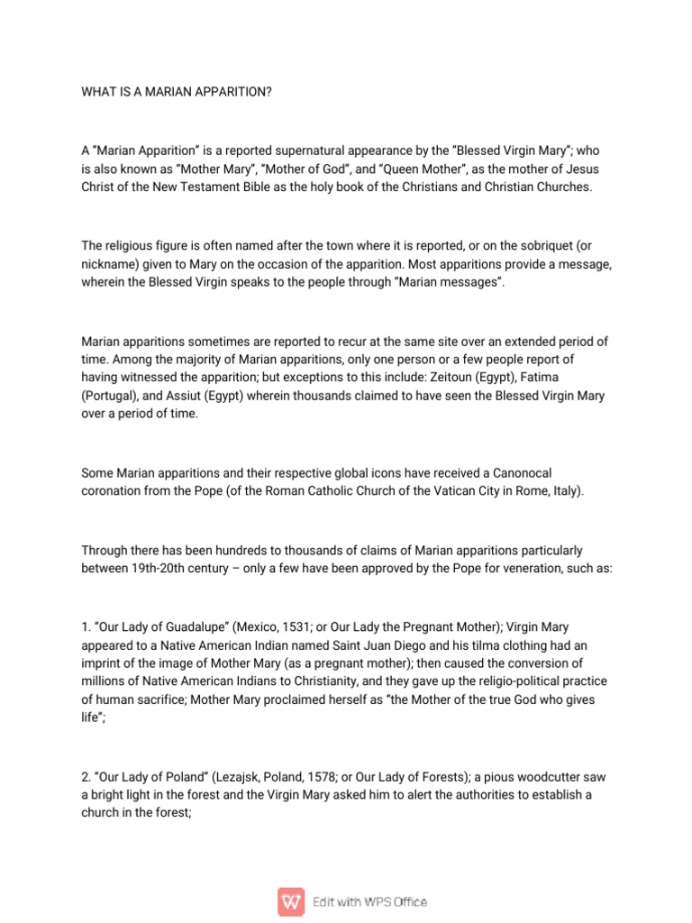 A “Marian Apparition” is a reported supernatural appearance by the “Blessed Virgin Mary”; who