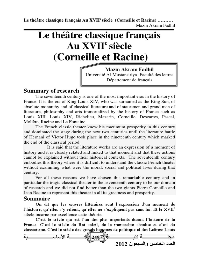 بيير كورنيه و جان راسين والذي يجسج كل منهم فترة متميزة في الحياة السياسية واالدبية والثقافية في