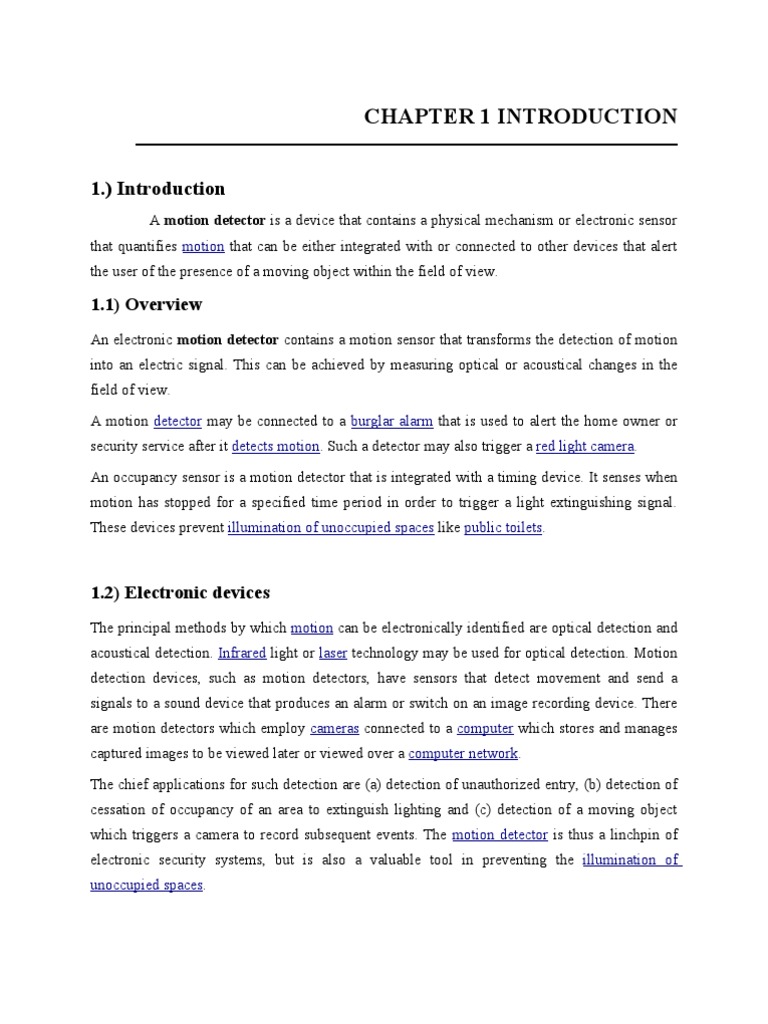 An electronic motion detector contains a motion sensor that transforms the detection of motion into an electric signal. This can be achieved by measuring optical or acoustical changes in the field of view. A motion detector may be connected to a burglar alarm that is used to alert the home owner or security service after it detects motion. Such a detector may also trigger a red light camera. An occupancy sensor is a motion detector that is integrated with a timing device. It senses when motion has stopped for a specified time period in order to trigger a light extinguishing signal. These devices prevent illumination of unoccupied spaces like public toilets.