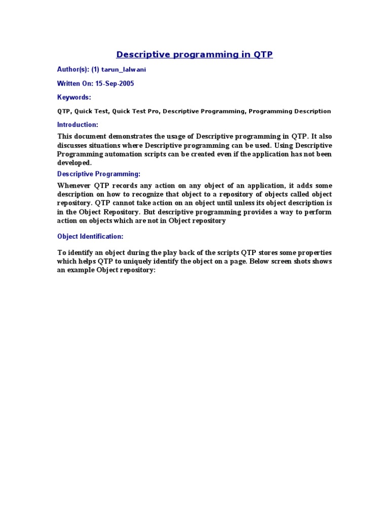 changes according to the user of the application, Ex. Logout <<UserName>>. 2.When object repository is getting huge due to the no. of objects being added. If the size of Object repository increases too much then it decreases the performance of QTP while recognizing a object. 3.When you dont want to use object repository at all. Well the first question would be why not Object repository? Consider the following scenario which would help understand why not Object repository Scenario 1: Suppose we have a web application that has not been developed yet. Now QTP for recording the script and adding the objects to repository needs the application to be up, that would mean waiting for the application to be deployed before we can start of with making QTP scripts. But if we know the descriptions of the objects that will be created then we can still start off with the script writing for testing Scenario 2: Suppose an application has 3 navigation buttons on each and every page. Let the buttons be Cancel, Back and Next. Now recording action on these buttons would add 3 objects per page in the repository. For a 10 page flow this would mean 30 objects which could have been represented just by using 3 objects. So instead of adding these 30 objects to the repository we can just write 3 descriptions for the object and use it on any page. 4.Modification to a test case is needed but the Object repository for the same is Read only or in shared mode i.e. changes may affect other scripts as well. 5.When you want to take action on similar type of object i.e. suppose we have 20 textboxes on the page and there names are in the form txt_1, txt_2, txt_3 and so on. Now adding all 20 the Object repository would not be a good programming approach.
