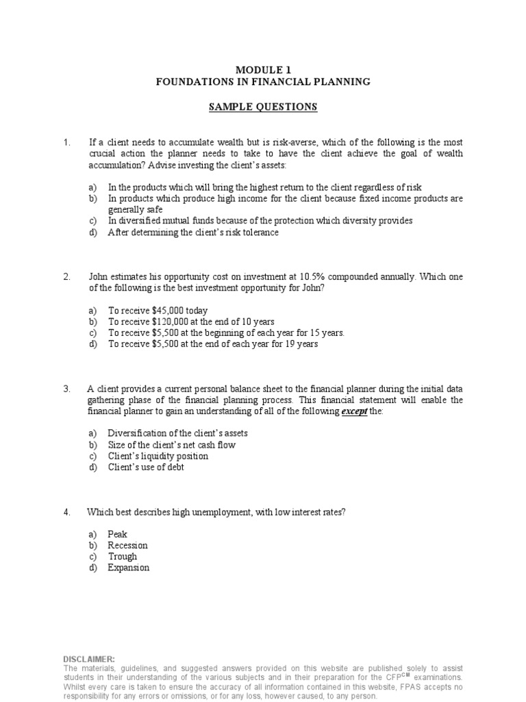 MODULE 1 FOUNDATIONS IN FINANCIAL PLANNING SAMPLE QUESTIONS