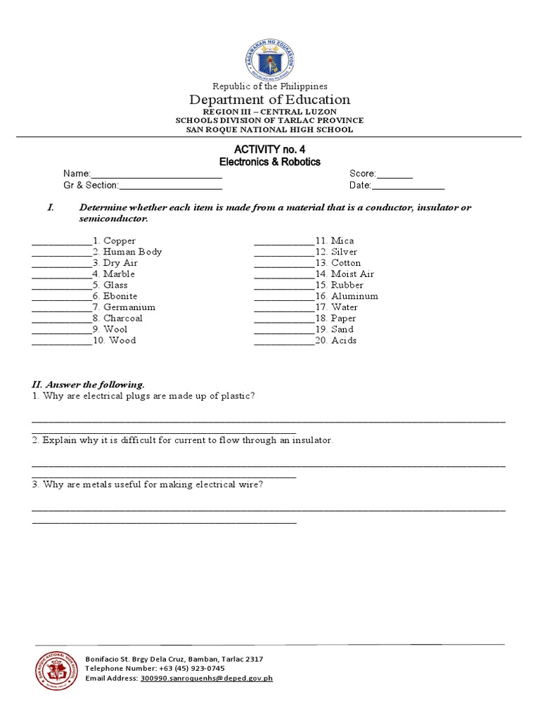 I. Determine whether each item is made from a material that is a conductor, insulator or