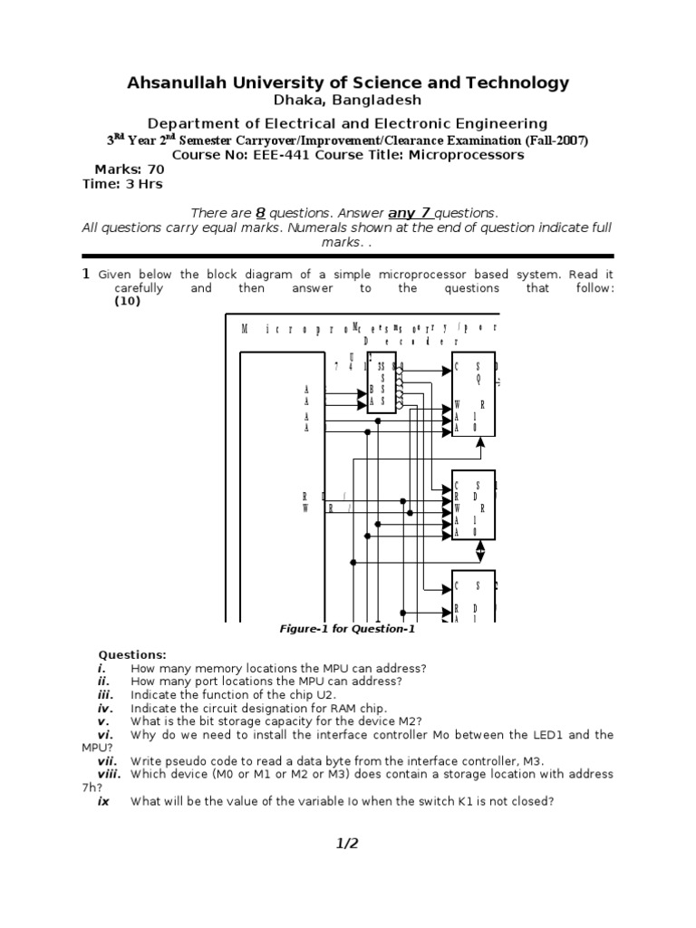 Course No: EEE-441 Course Title: Microprocessors Marks: 70 Time: 3 Hrs There are 8 questions. Answer any 7 questions. All questions carry equal marks. Numerals shown at the end of question indicate full marks. .
