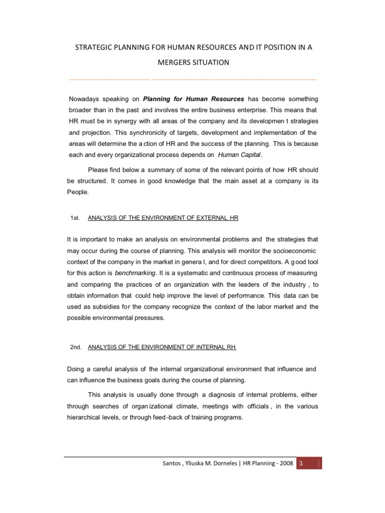 STRATEGIC PLANNING FOR HUMAN RESOURCES AND IT POSITION IN A MERGERS SITUATION