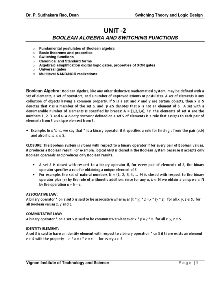 o o o o o o Fundamental postulates of Boolean algebra Basic theorems and properties Switching functions Canonical and Standard forms Algebraic simplification digital logic gates, properties of XOR gates Universal gates Multilevel NAND/NOR realizations