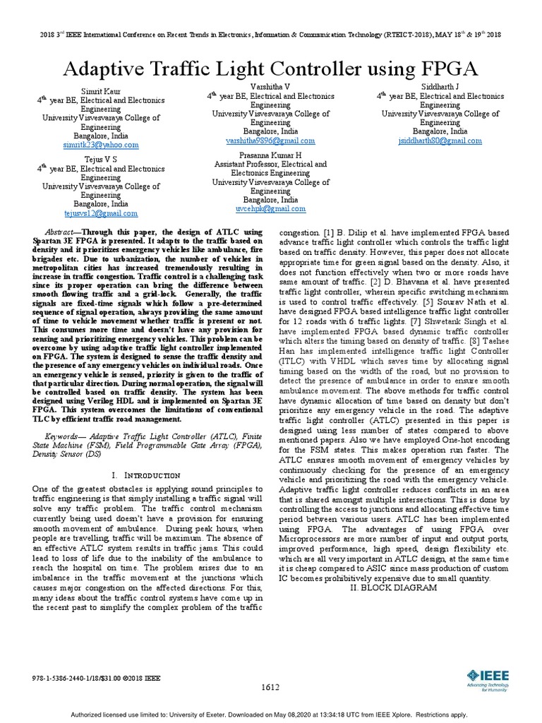 An Adaptive traffic light controller using FPGA has been [4] S. Nath et al., “Design of an Intelligent Traffic Light Controller