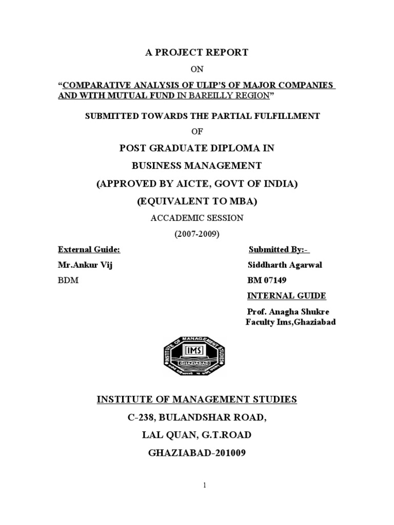 ON COMPARATIVE ANALYSIS OF ULIPS OF MAJOR COMPANIES AND WITH MUTUAL FUND IN BAREILLY REGION SUBMITTED TOWARDS THE PARTIAL FULFILLMENT OF