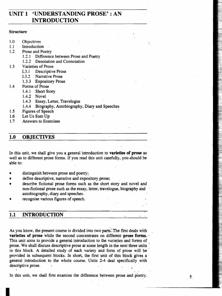 Objectives Introduction Prose and Poetry 1.2.1 Difference between Prose and Poetry 1.2.2 Denotation and Connotation Varieties of Prose 1.3.1 Descriptive Prose 1.3.2 Narrative Prose 1.3.3 Expository Prose Forms of Prose 1.4.1 Short Story 1.4.2 Novel 1.4.3 Essay, Letter, Travelogue 1.4.4 Biography, Autobiography, Diary and Speeches Figures of Speech Let Us Sum Up Answers to Exercises